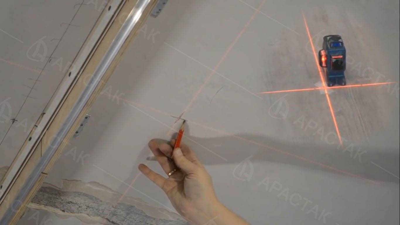 Перед установкой полотна натяжной конструкции на поверхности потолка обязательно проводится разметка. Характер разметки будет зависеть от типа и формы покрытия (одно или многоуровневый потолок), от высоты натяжной конструкции и особенностей освещения. Чтобы правильно замерить потолок, необходимо поставить нужные отметки в углах комнаты, например, лазерным уровнем. Полученные точки соединяются таким образом, чтобы по всему периметру проходила сплошная линия (поможет строительный шнур). Между линией и перекрытием образуется расстояние, которое нужно измерить. Отмерять нужно и расстояние от нижней точки, чтобы увидеть верхний уровень натяжки.