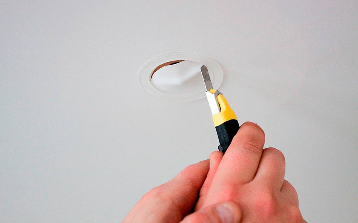 ![]() Шаг 13 | Если планируется монтаж точечных светильников – установите уплотнительные кольца и вырежьте внутри их отверстие для светильника. Будьте особенно аккуратны, так как исправить дефекты потом будет крайне сложно или даже невозможно. |