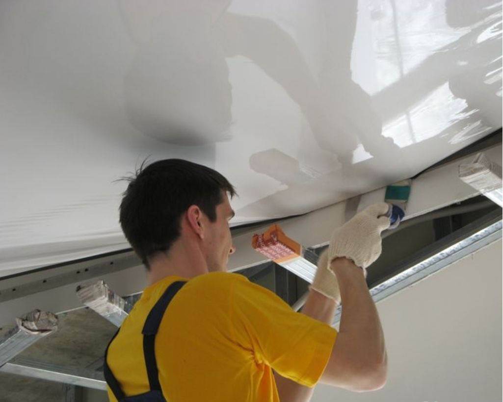 При повреждении виниловой плёнки, место пореза также можно заклеить заплатой, обычно монтажники оставляют небольшой кусок полотна