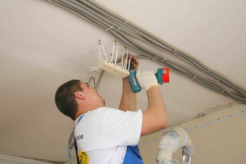 Кроме того, стоимость зависит от сложности работ: значение имеет геометрия комнаты, количество светильников, датчиков сигнализации, труб и проводов, а также необходимость установки скрытой подсветки под потолком.