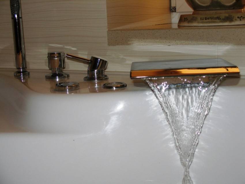 Еще одна разновидность таких смесителей – каскадные, излив которых более широкий и узкий. Через него проходит в 2-3 раза больше воды, чем через обычный излив, что не очень экономно. Они хорошо смотрятся в больших помещениях и могут быть использованы в качестве смесителя для ванны или раковины как стильное дополнение интерьера.
