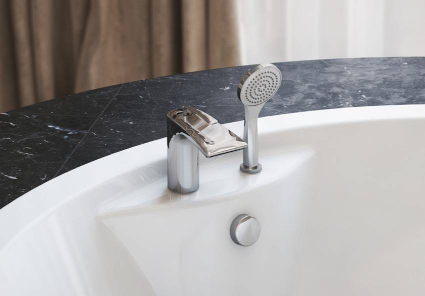 - Устанавливаемые на бортике ванны или плиточном бортике. Чаще всего такой смеситель устанавливают на бортах акриловых ванн, где имеются специально выделенное место. Очень редко их устанавливают на бортиках стальных ванн. Главное преимущество такого вида крепления это скрытый шланг од душа, который убирается в специальное отверстие. Но это преимущество чисто эстетическое, так как шланг при таком способе крепления чаще изгибается, а значит, и меньше служит.
