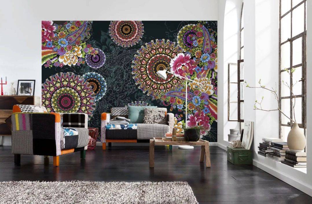 Яркая расцветка и большой узор будут компенсировать большие расстояния между стенами, а цвет постепенно затухать.