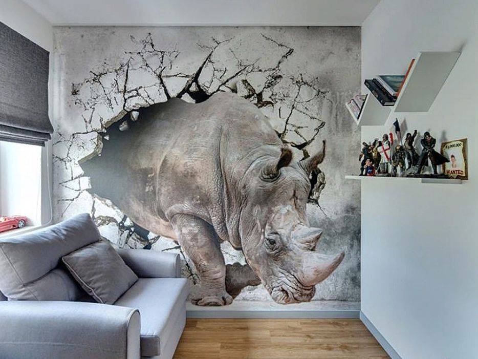 На фото гостиная и стена с 3д фотообоями с носорогом.