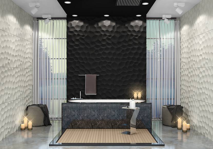 При выборе подсветки объёмных стеновых плит, отдают предпочтение нескольким источникам. С помощью мягкого света можно удачно подчеркнуть узор и рельеф, выделить глубину, проявить орнамент.