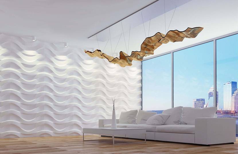 Чаще всего для производства 3д панелей применяют гипс, который заливают в формы. Это дешевый, экологически чистый и негорючий материал. Ему не страшны температурные колебания. Однако на гипсовую отделку плохо влияет повышенная влажность воздуха. Преимуществом данных панелей является то, что они очень просто монтируются. Их приклеивают к стене специальным клеем, закрепляя для надежности дюбелями в некоторых местах. В продаже имеются панели из гипса разной расцветки, однако при необходимости можно купить неокрашенные изделия и покрасить их в любой другой цвет.