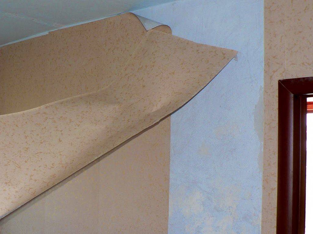 Виниловые обои при снятии не рвутся на куски, а отстают от стены целыми полосами. Если на стене остается часть бумажной основы, ее легко можно убрать, смочив водой и поддев шпателем.