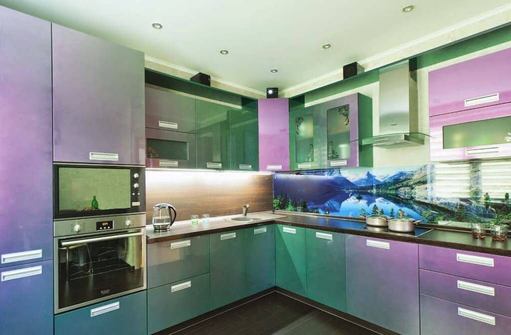 Кухни с глянцевыми поверхностями, где в нижней или верхней части используются различные тона, смотрятся очень оригинально. Можно выбрать близкие или контрастные тона.