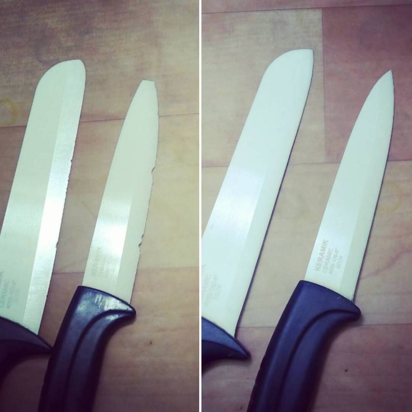 Это значит, что острая режущая кромка керамического лезвия не является таковой изначально. А в этом-то и кроется ответ на первый вопрос: да, такие ножи точить можно.