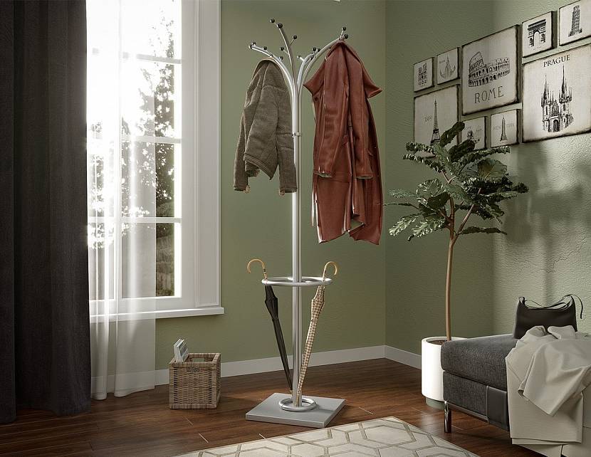 Напольная вешалка на ножке в углу просторной прихожей не занимает много пространстваИсточник shop-modern.ru