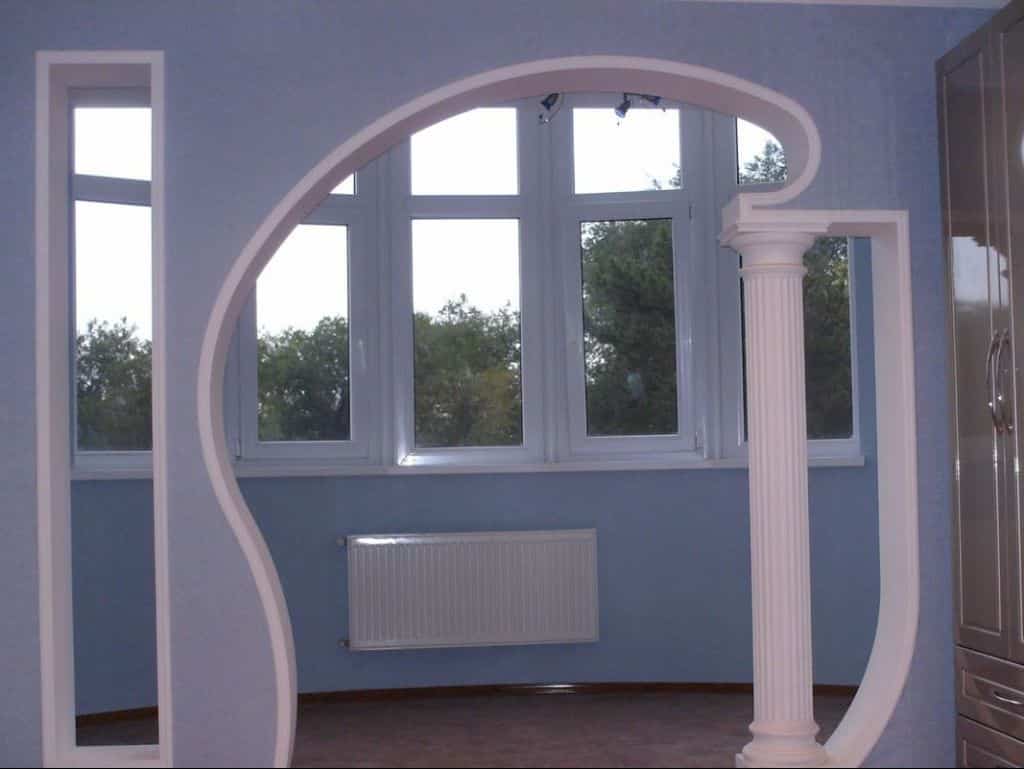 Балконы с аркой, выходящей в гостиную, можно оформить большими интересными колоннами. Это помпезный и роскошный вариант, который прекрасно подойдёт для оформления комнаты в классическом стиле. Очень недорогим вариантом отделки является покраска. В этом случае арку необходимо сначала оштукатурить, а затем покрыть несколькими слоями краски. Причём лучше, если цвет краски сочетается с цветовым решением соединяемых проходом помещений.