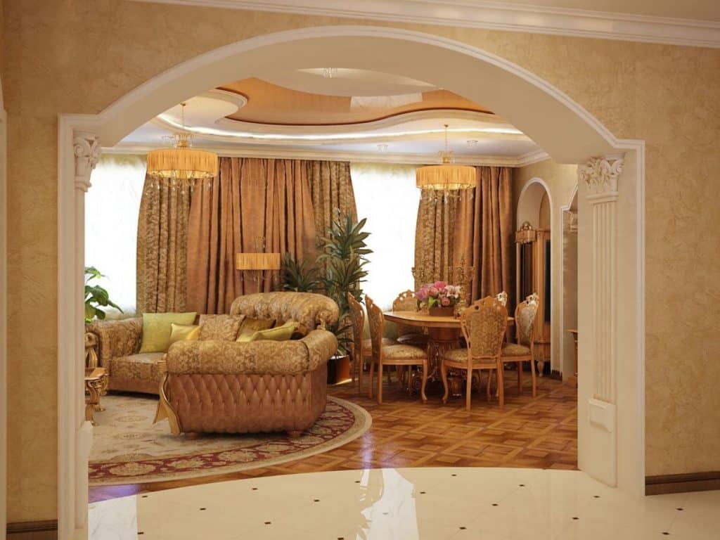 Многие предпочитают такой вариант за его мягкость, отсутствие острых углов, это делает переходы между комнатами более незаметными. Идеально вписывается арка при выходе в холл, если он достаточно широкий, перемещение между помещениями будет незаметным.