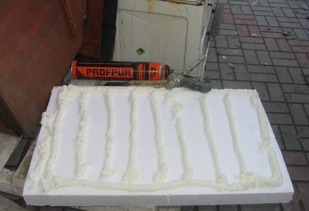 - Плотно уложите листы пенопласта, закрепите стыки клеем или монтажной пеной.