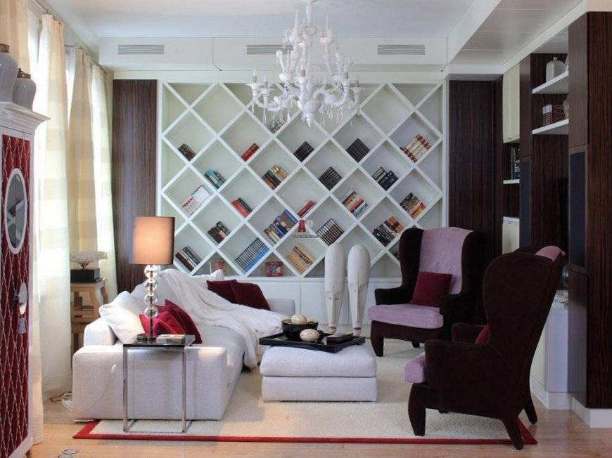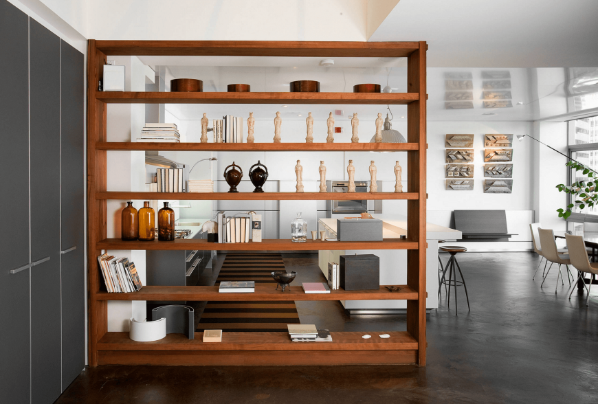 Дизайнеры часто используют полочные композиции для разделения комнаты на функциональные области. Для каждого стиля разработана конкретная схема расположения полок.