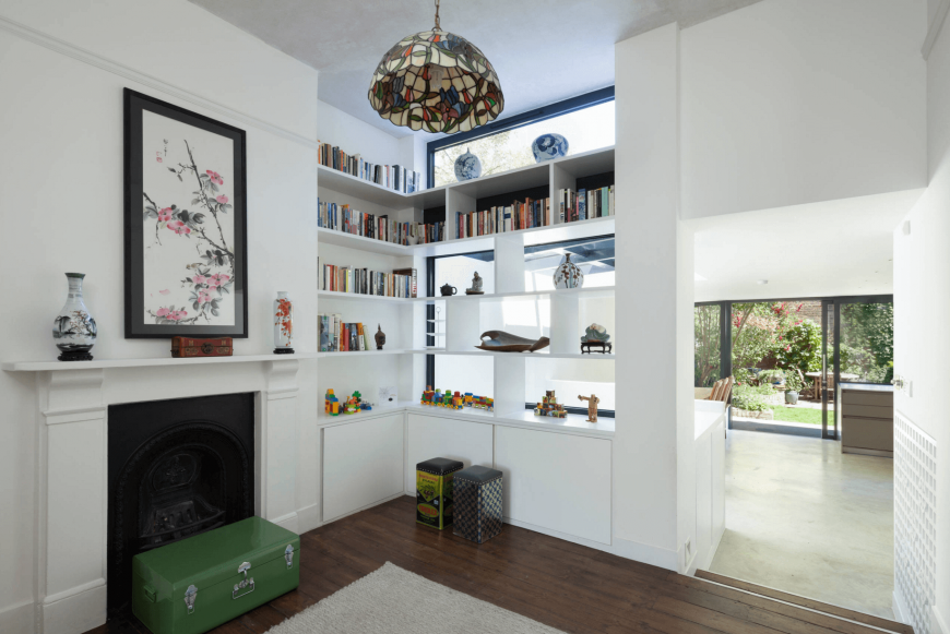 Иногда на полках располагают минимум предметов, чтобы подчеркнуть особенность стиля и общий колорит дизайна.
