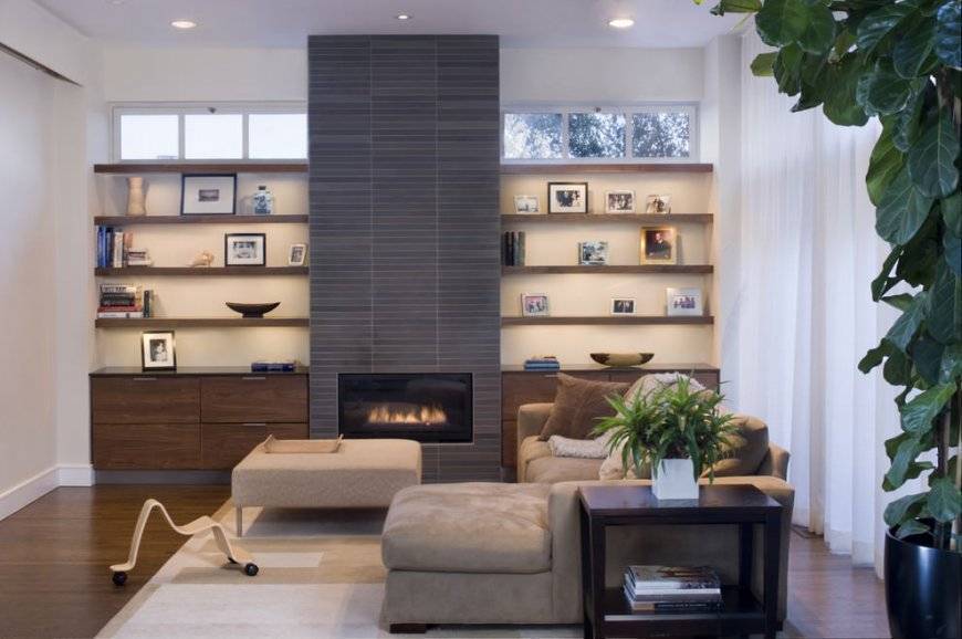 В интерьере многих нынешних гостиных полки выполняют очень серьезную роль. На них размещают предметы, с их помощью разграничивают пространство и создают единый стиль в помещении. При правильном оформлении они способны качественно преобразить обстановку комнаты. Абсолютно не имеет значения, являются ли полки частью мебели или выступают обособленной группой.