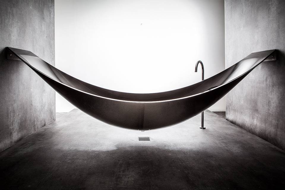 Дизайн этой ванны-гамака, сделанной из углеводородного материала, просто поражает воображение. Парящая в воздухе, она всё же прекрасно выполняет своё функциональное назначение: внизу, под ванной, сделан слив в канализационную систему.