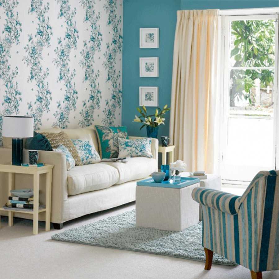 Различные оттенки голубого, в том числе бирюза, небесно-голубой, циан и другие, расширяют и освежают пространство. От стен веет прохладой. Частенько их используют для оформления маленьких комнат с низкими потолками.