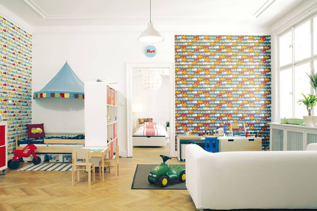 одна стена оформляется яркими обоями, остальные – фоновыми. Такой вариант часто применяется в отделке детской комнаты;