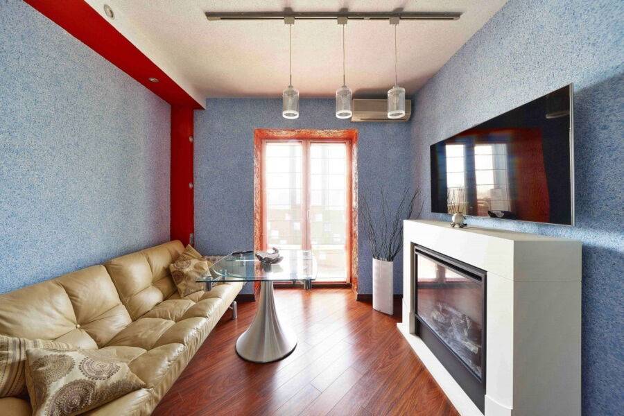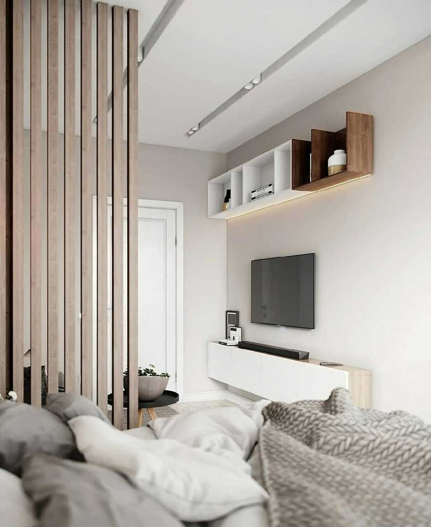 Другой вариант – использование различных фактур материалов отделки. Это может быть отделка деревом в спальной зоне и декоративной штукатуркой в гостиной.