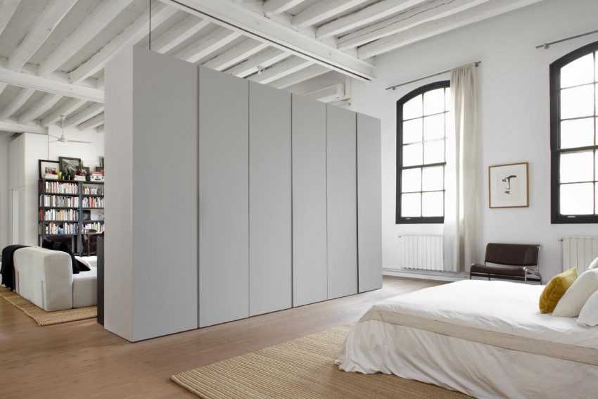 Если квадратура позволяет, то разделение на зоны может быть выполнено при помощи стеллажа или шкафа.