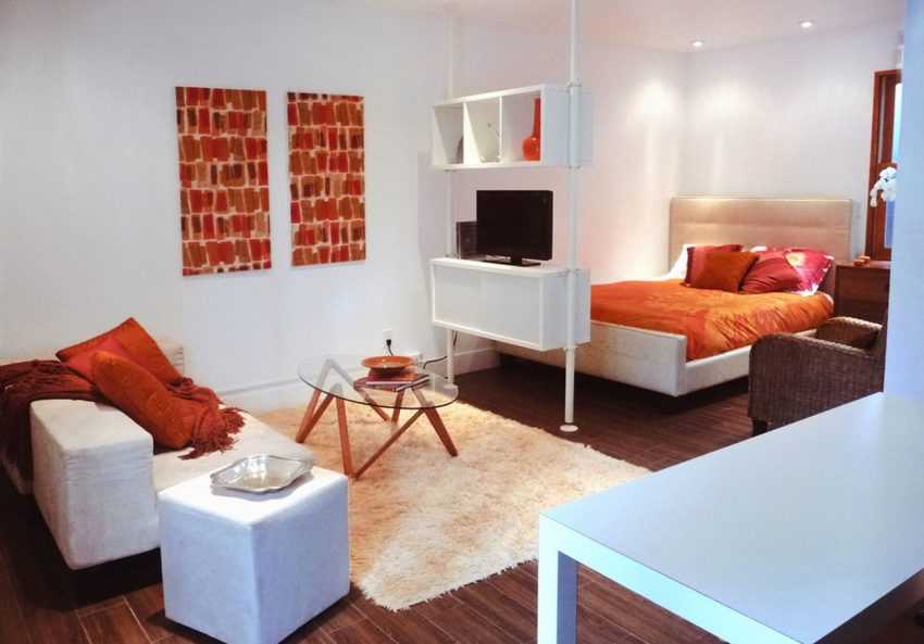 Кроме стен, помочь разделить пространство может оформление потолка, покрытия пола, организация системы освещения. Для зоны гостиной должен быть предусмотрен более яркий свет, чем для спального места.