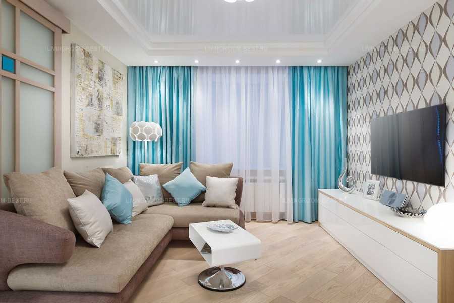 Примеры синих штор в интерьере гостиной представлены на фото. Так как пространство не позволяет, в гостиной лучше отказаться от тяжелых и темных портьер, чтобы не перегрузить пространство и не сделать его слишком мрачным
