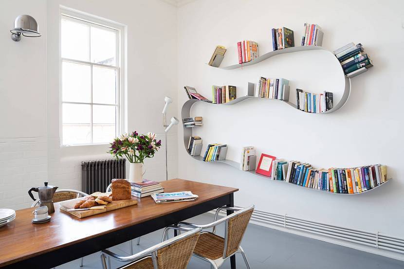 Такие конструкции неизбежно превращаются в интерьерную изюминку комнаты. Единственным значимым недостатком большинства подобных полок является их ограниченная вместимость.
