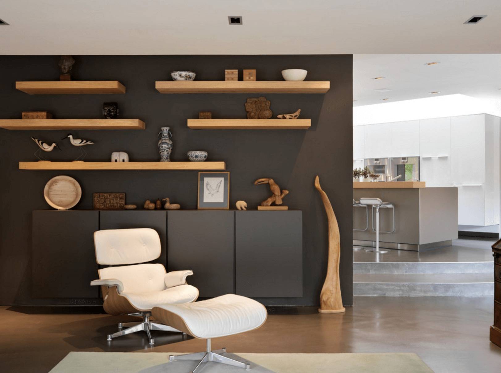 В дизайне интерьера современной библиотеки не используются наработки, характерные для классической традиции. Здесь ценится не следование нормам, а эксперимент. По этой причине в современных гостиных и кабинетах встречаются стеллажи и полки самых нестандартных конфигураций, многие из которых изготовлены лично хозяевами.