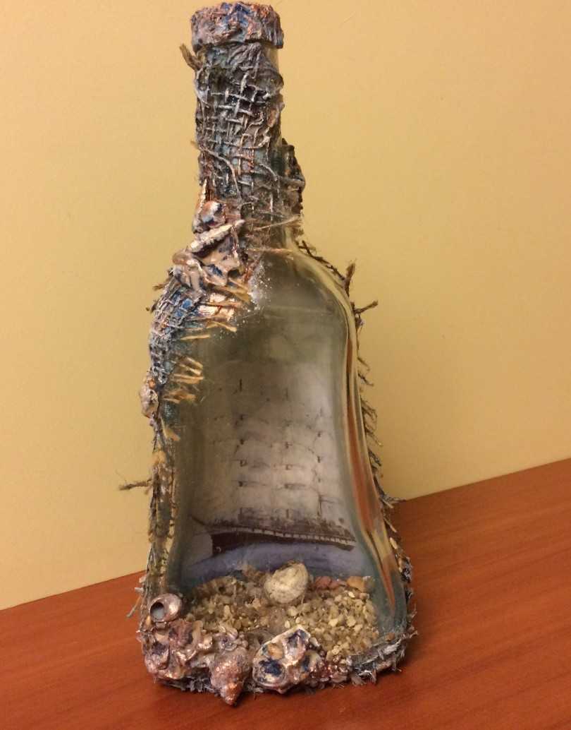 Такая бутылка естественным образом впишется в жилое помещение, выполненное в аналогичном стиле. Для украшения лучше использовать сосуды нестандартной формы. Внешнюю поверхность можно покрыть серебристой, золотой краской, старыми кнопками, шпильками и т.п.