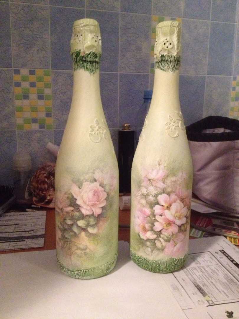 Пошаговый декупаж бутылки шампанского к новому году своими руками выполняется следующим образом. Бутылка очищается от этикеток, остается нетронутой фольга. Стекло обезжиривается.