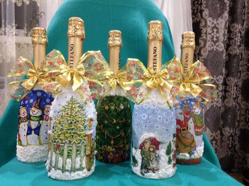 Серия новогодних бутылок, украшенных с помощью техники декупаж