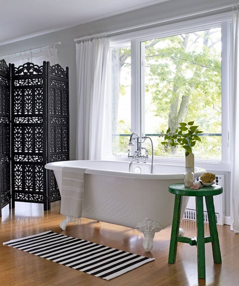 Если размер помещения позволяет, можно установить ванну в центре. Для деревянного дома такая схема расстановки очень удобна и практична. Стены в этом случае не контактируют с водой, что значительно продлевает срок службы их отделки
