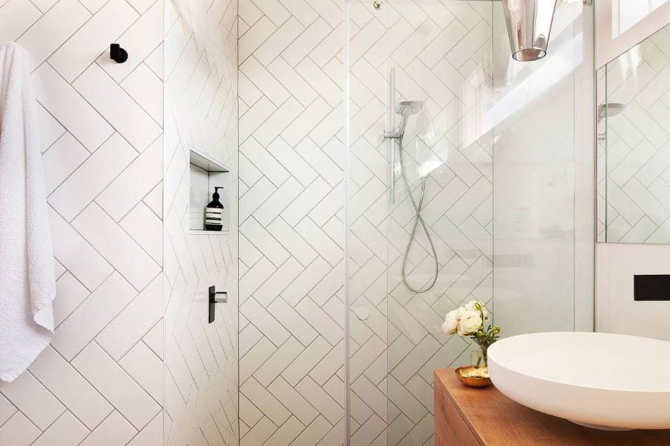 Раковину необходимо устанавливать в противоположном углу от душевой кабины, чтобы уравновесить интерьер. Рядом можно установить стиральную машинку, чтобы оставить середину свободной.