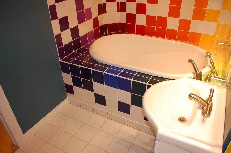 Само собой, первым делом нужно выбрать основной фон помещения. В маленьких ванных комнатах не стоит использовать темные цвета, так как они визуально уменьшают помещение. Идеальным тонами для оформления миниатюрных санузлов являются белый, бежевый и некоторые другие теплые оттенки. Если в ванной комнате есть, где “разгуляться”, не бойтесь экспериментировать с расцветками. Например, очень эффектно смотрится оформление санузла в таких контрастных цветовых сочетаниях, как фиолетовый-белый, салатовый-бежевый, лазурный-песочный. Что касается отделочных материалов, оптимальным является кафельная плитка. Она неприхотлива в уходе и имеет эстетичный внешний вид. Сегодня с помощью кафельной плитки можно создавать великолепные узоры, превращающие дизайн ванной комнаты в настоящее произведение искусства.