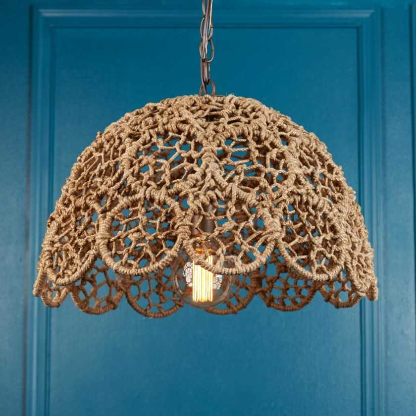 - Необычно смотрятся в интерьере абажуры из ниток в технике макраме