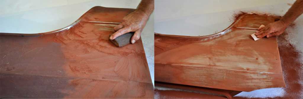 Для очистки угловых частей и боков изделия используют железную щетку. Когда основная часть старого состава удалена, углы и бока обрабатывают наждачной губкой. Обработку можно провести шлифовальной машиной, что позволит сделать поверхность гладкой. После этого изделие протирают мокрой тряпкой, чтобы удалить пыль и опилки, ждут полного высыхания и приступают к покраске.