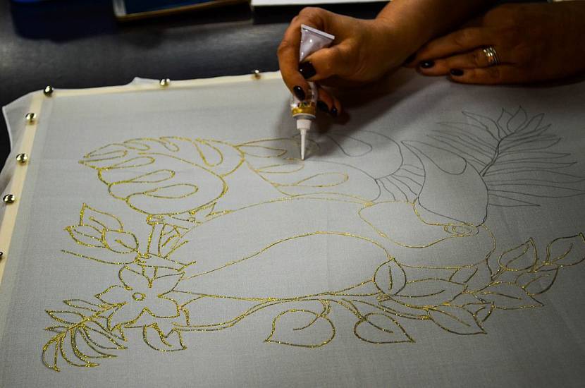 Золотистый контур, удерживающий акриловые краски от растекания по тканиИсточник artivitro.com
