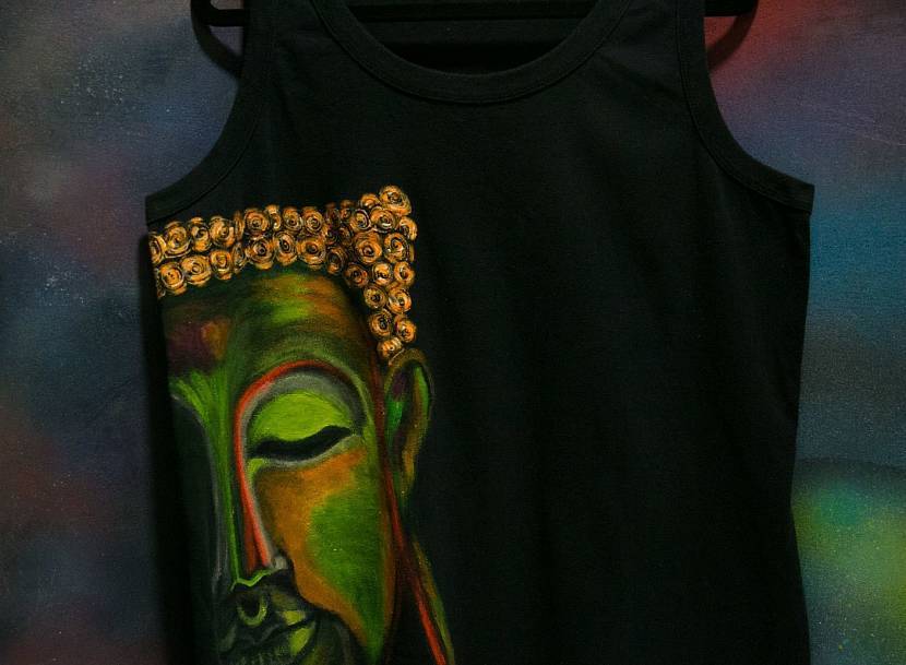 Изображение Будды на футболке выполнено флуоресцентными акриловыми краскамиИсточник livemaster.ru