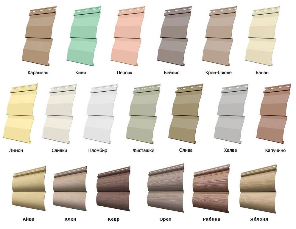 Выбора цвета виниловых панелей несколько ограничен. К тому же, невозможно получить яркий оттенок, поскольку любой цвет, смешанный с ПВХ, бледнеет. Несмотря на это, из представленной палитры можно подобрать вариант для зданий, оформленных в любом стиле и достичь гармонии.