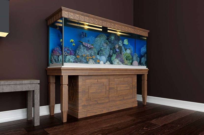 Для классики аквариумы украшают росписью, резьбой, обрамляют багетами и даже лепниной. Например, круглые емкости устанавливают на скульптурные подставки или деревянные тумбы ручной работы. Что касается подсветки, она тоже зависит от стиля помещения: