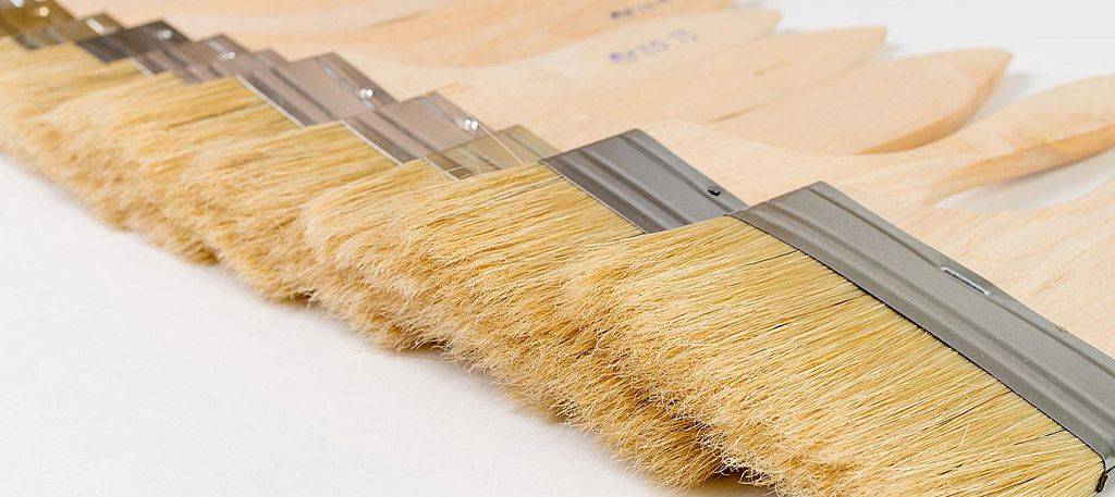 Если основание фактурное (древесина, кирпичная кладка, рельефная штукатурка), выбирайте кисти – широкую для сплошного нанесения и узкую для прокрашивания углов. Убедитесь, что ворс держится прочно, иначе при растирании вязкой краски щетинки останутся на поверхности и будут портить вид.