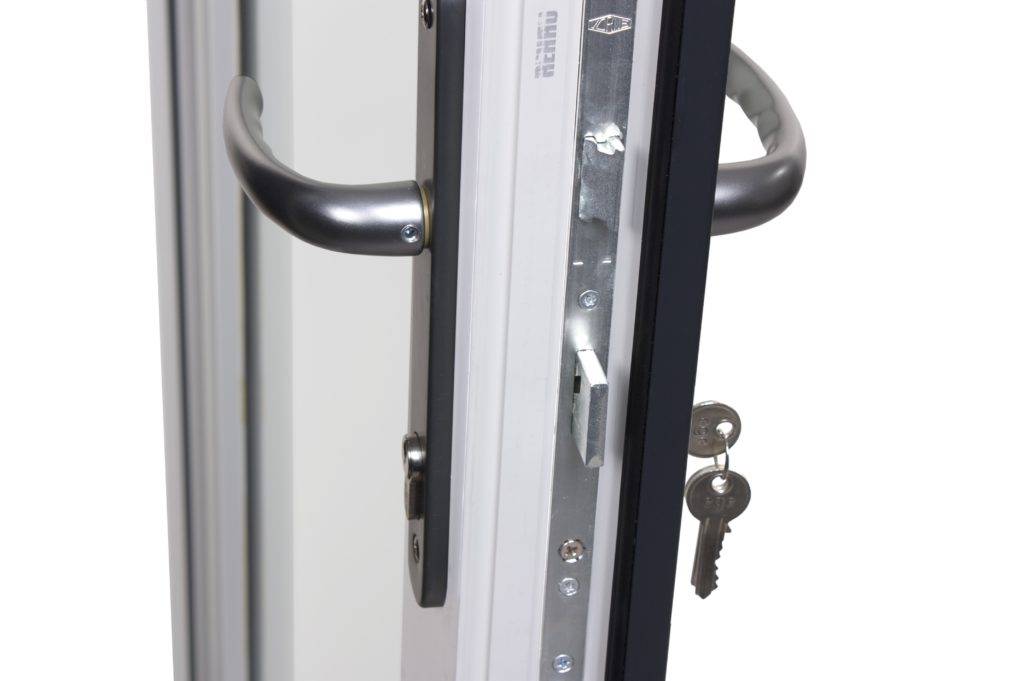 Одним из важнейших элементов двери является замок. Устройство запорных элементов может различаться. Существуют простые замки и более сложные варианты. Из незатейливых конструкций в алюминиевых дверях рекомендуется использовать ригельные запорные элементы с несколькими точками закрепления полотна. Для входных групп лучшим решением является врезной замок.