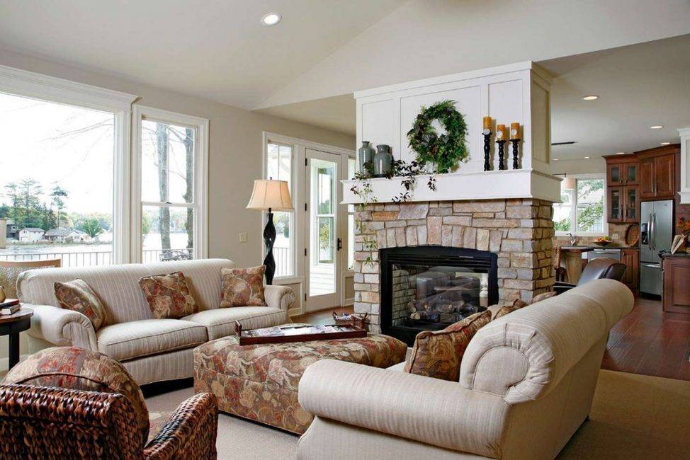 Если в зоне отдыха вы хотите создать уютный уголок с камином, теплым ковром и диванчиками, можете расположить там одну элегантную люстру – не больше.