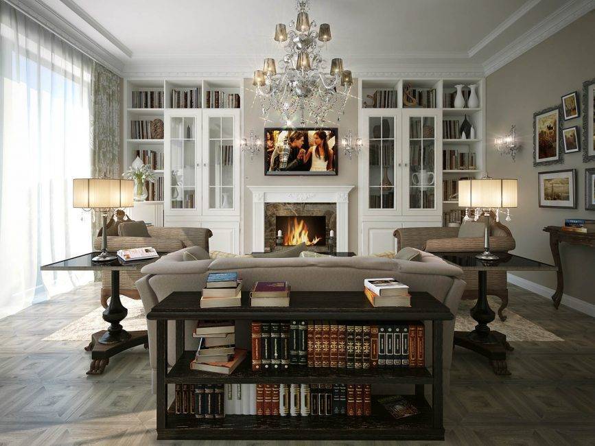 - старомодный и благородный, он содержит много традиционной мебели: мягкие кресла, пуфики, банкетки, диван, буфет, консоль, трюмо, стеллаж, комод;