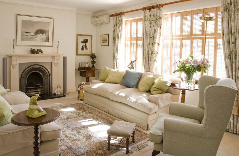 Потолок во всем доме должен быть белым. Возможно использование лепнины или деревянных балок. Отличным решением для гостиной будет размещение камина.