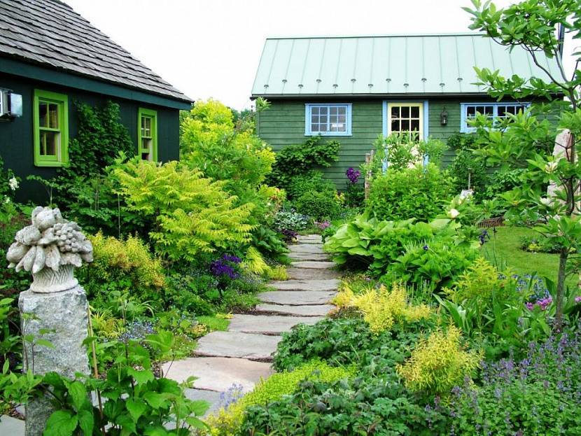 Разные части сада можно объединить с помощью извилистых тропинок, которые создают из натуральных материалов, таких как булыжник, песчаник, спилы деревьев.