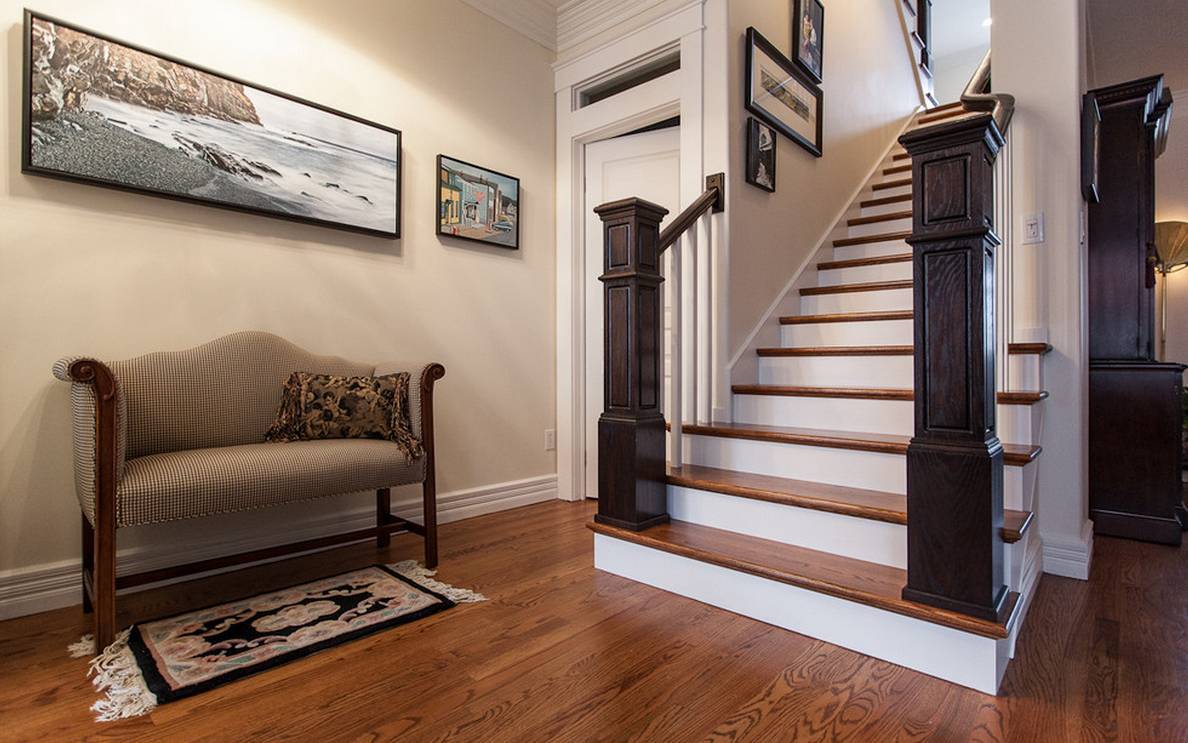 Если дом состоит из нескольких этажей, то истинным украшением жилища будет лестница, сделанная в буржуазном стиле. Она может быть контрастной, пространство между ступенями можно окрашивать в деревянные оттенки.