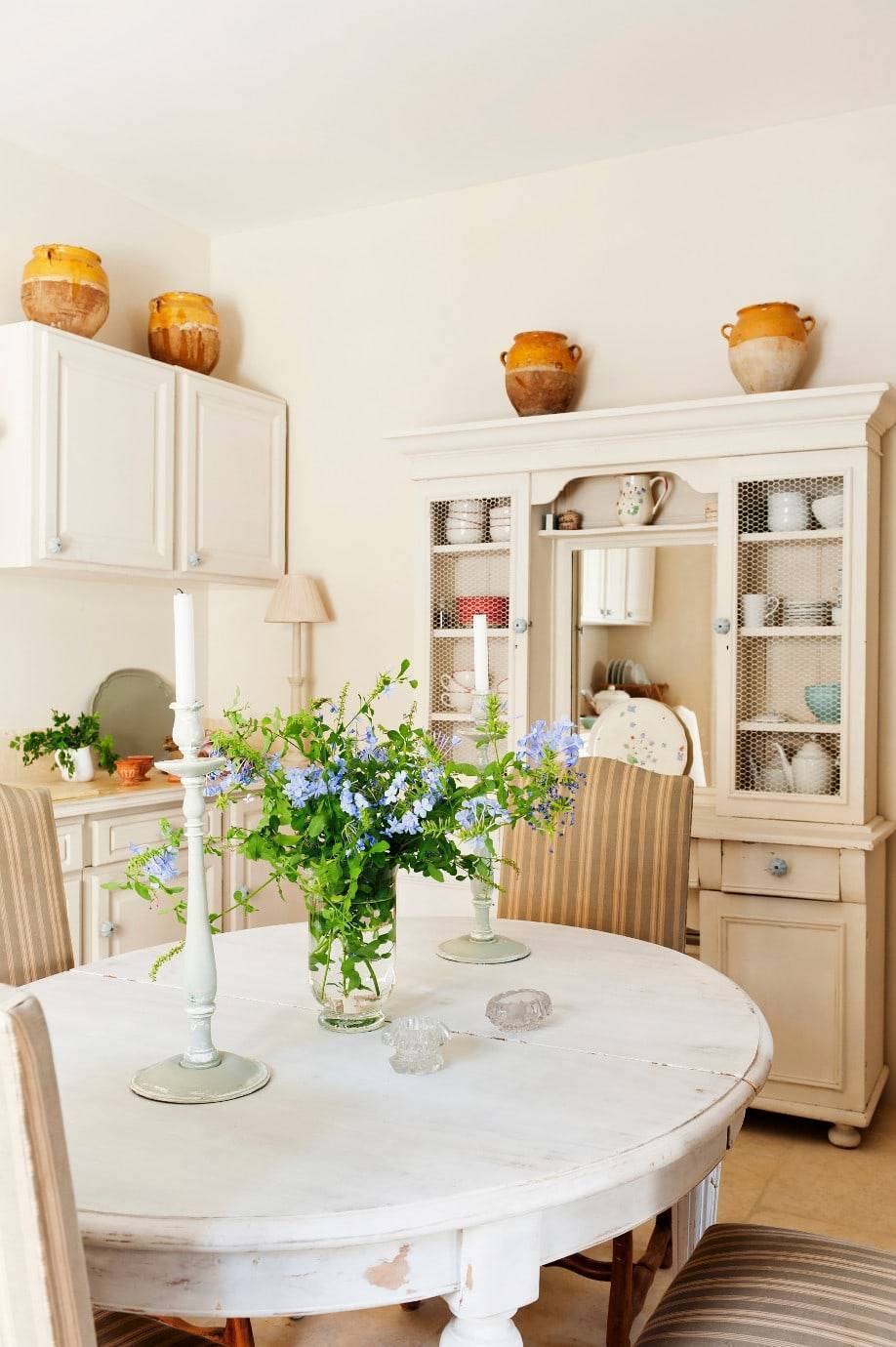 Для столовой отличным решением станет использование антикварных шкафчиков, которые выполнены в белом цветовом решении. В подобных интерьерах буфеты нужны не только для хранения посуды, но и чтобы выставить ее напоказ.
