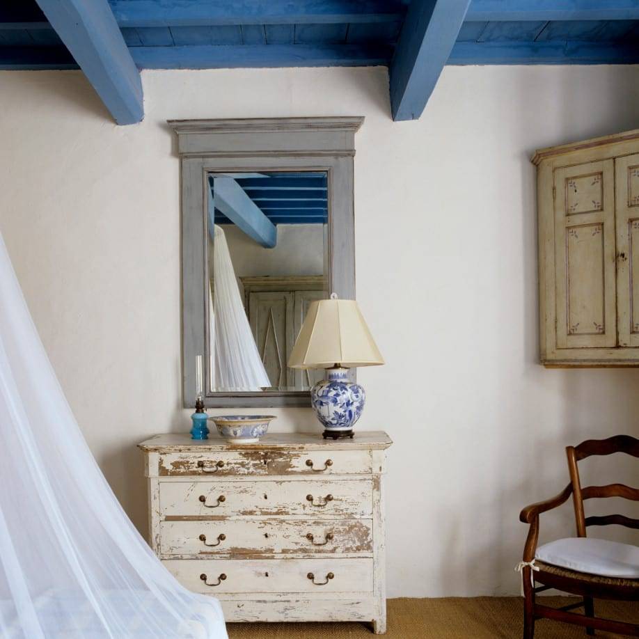 Мебель обычно деревянная, состоящая из натурального материала или побелена, иногда окрашена в пастель, теплые цвета. Дополнения, которые обычно встречаются, сделаны из: